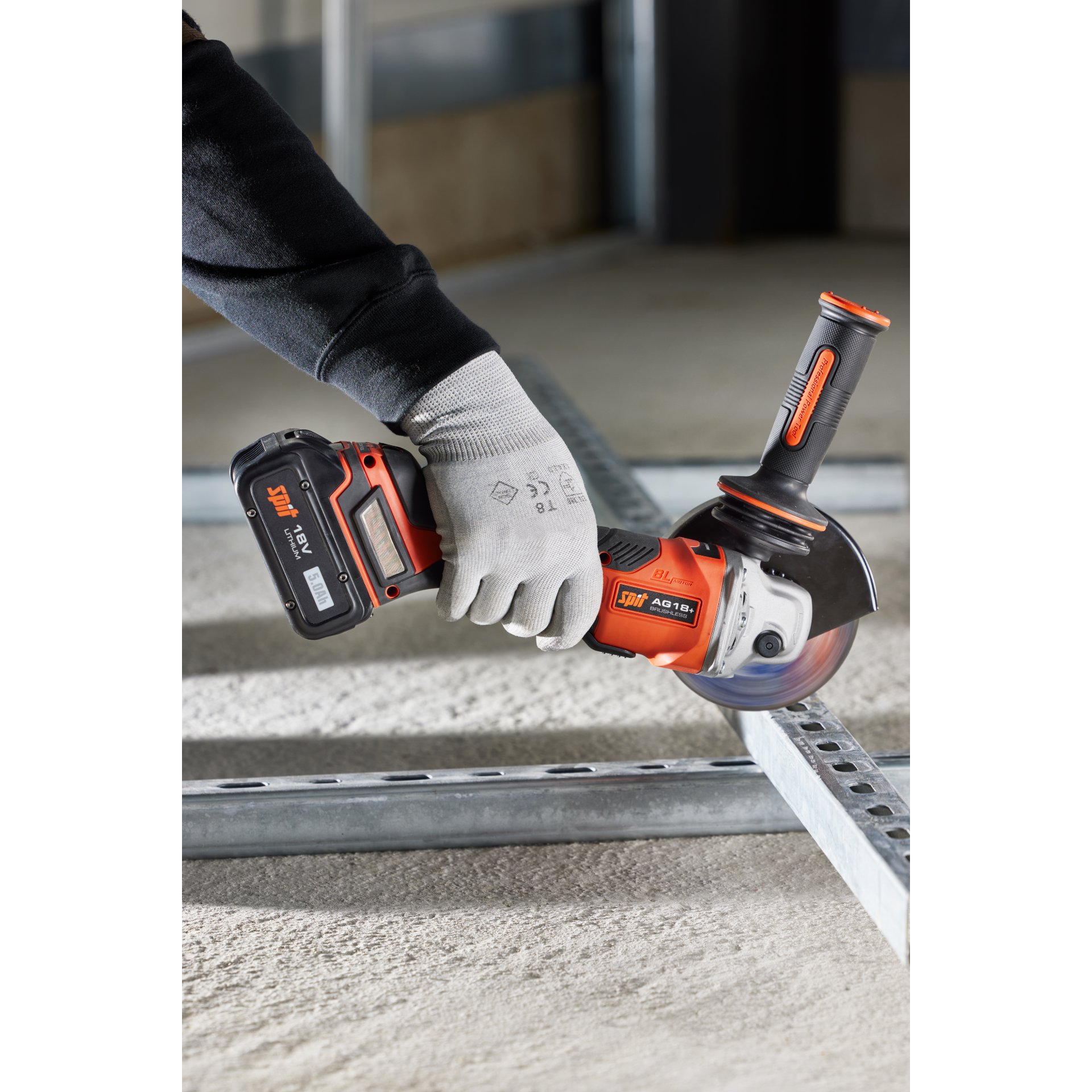 Hohe Arbeitseffizienz durch leistungsstarken Bürstenmotor und 3 Geschwindigkeitsstufen Hohe Lebensdauer durch Motorstaubschutz und abnehmbarem Staubschutzgitter Sicher arbeiten: Schutzhaube, Wiederanlaufschutz, elektrische Bremse, Überlastungsschutz, Kickback-Kontrolle ergonomischen Handgriff Kompatibel mit allen SPIT 18V 5,0/8,0Ah Akkus