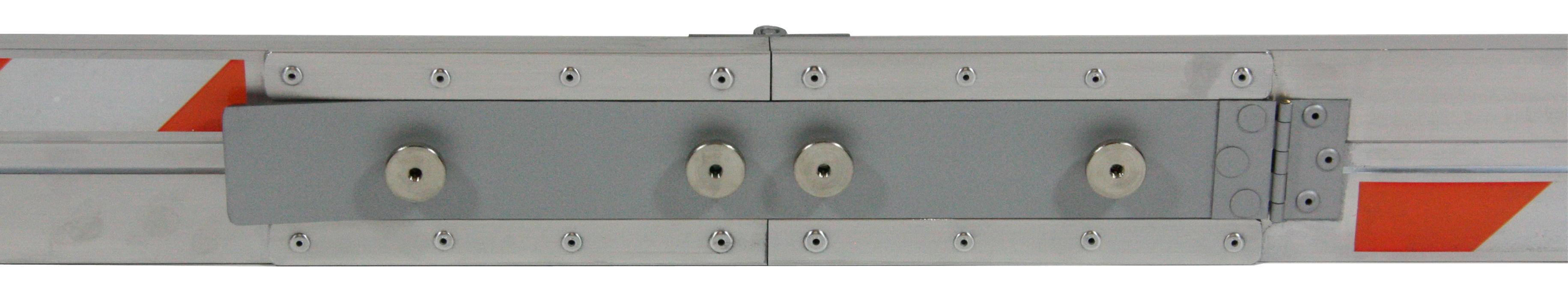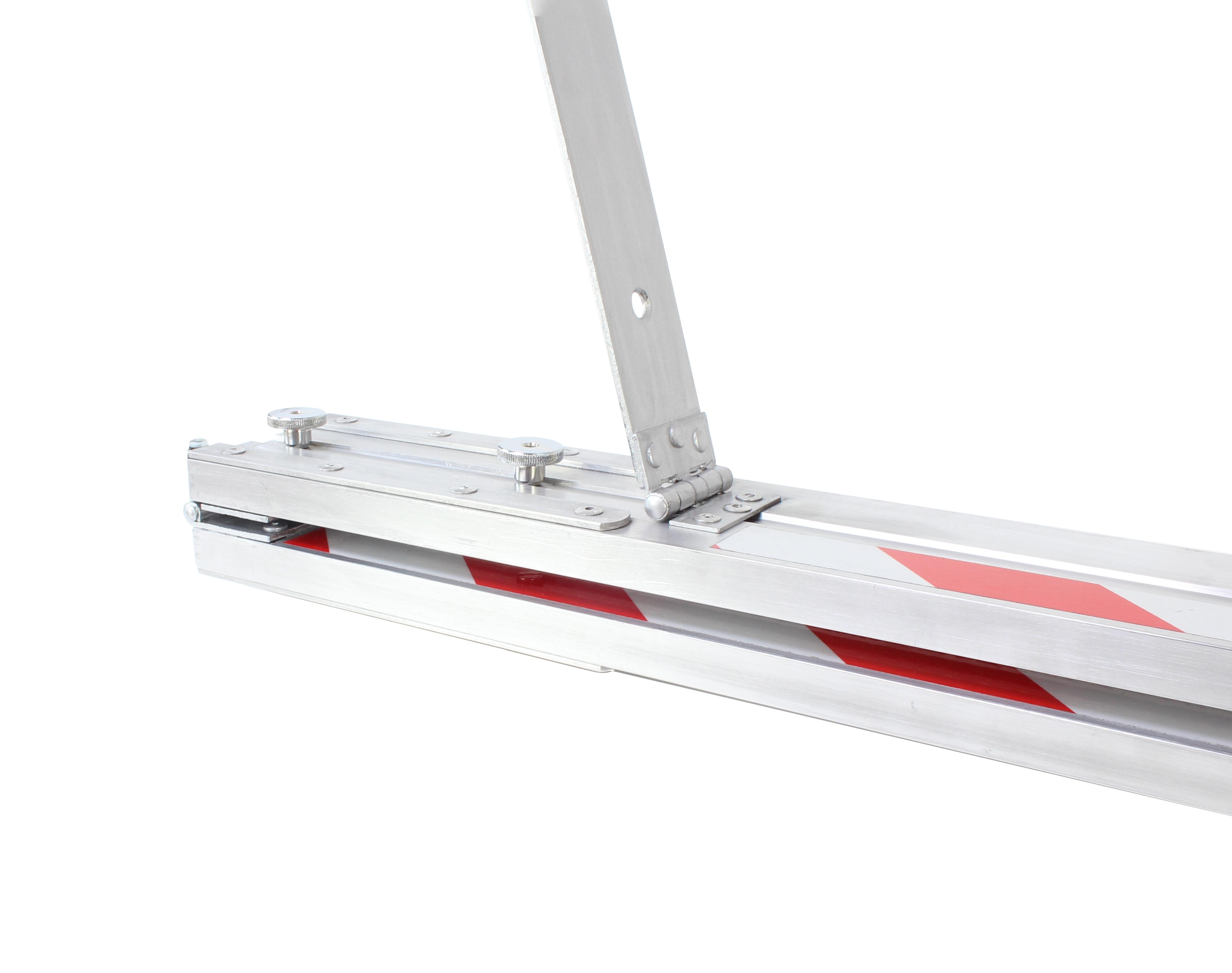 Diese Richtlatte hat drei Gelenke und ist ausgeklappt 5 m lang. Für den Transport kann die Richtlatte auf 1,25 m gefaltet werden. Das Aluminiumprofil hat einen Querschnitt von 90 x 18 mm.