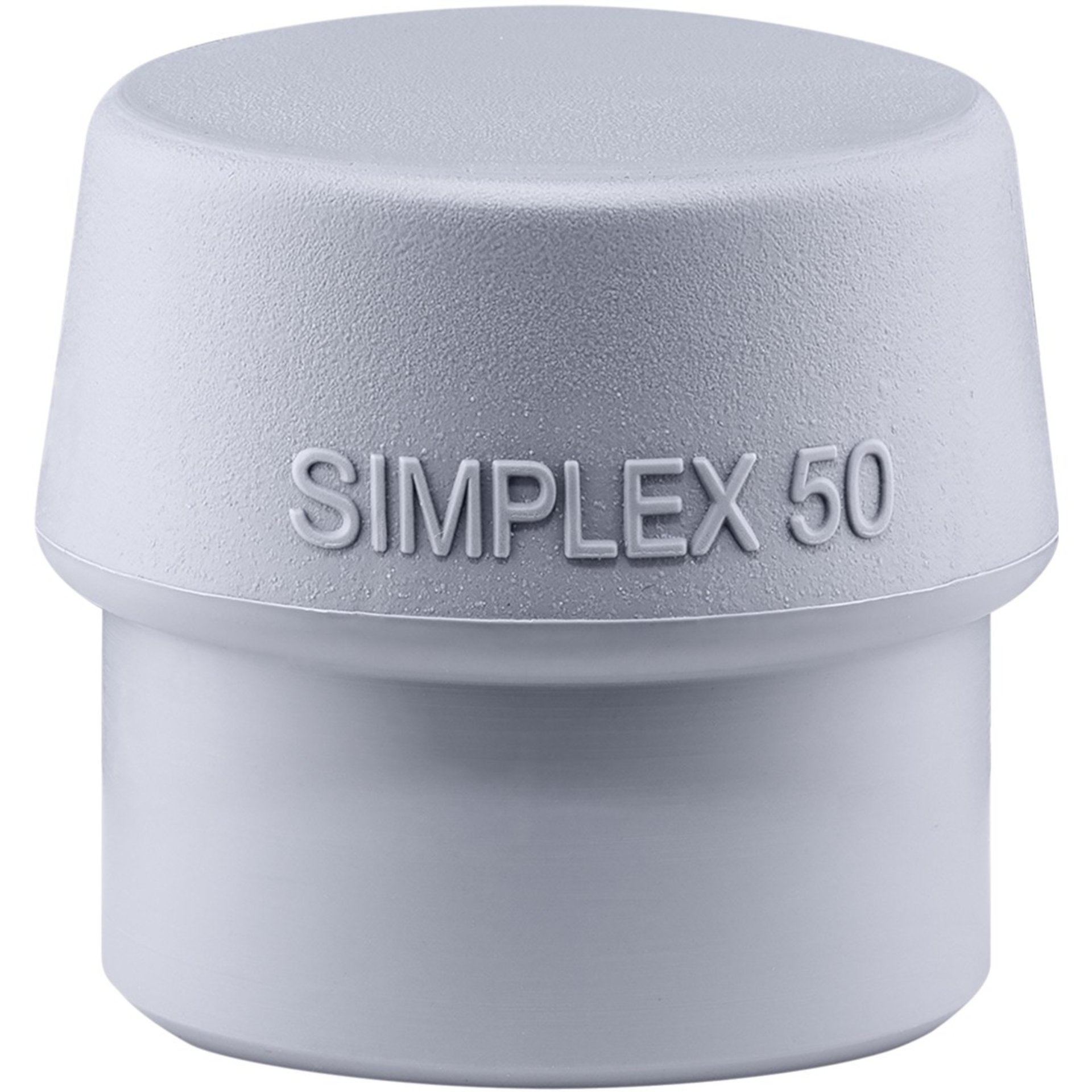 Der SIMPLEX-Schlageinsatz TPE-mid ist ein Thermoplast Elastomer und mit einer Härte von ca. 90 Shore A ein mittelharter Schlageinsatz (vergleichbar mit der Härte des Gummikomposition-Einsatzes Serie 3202). Dieser graue Einsatz hinterlässt im Vergleich zum herkömmlichen Gummihammer keinen unerwünschten schwarzen Abrieb. Erhältlich ist er von Größe D30mm bis D80mm.