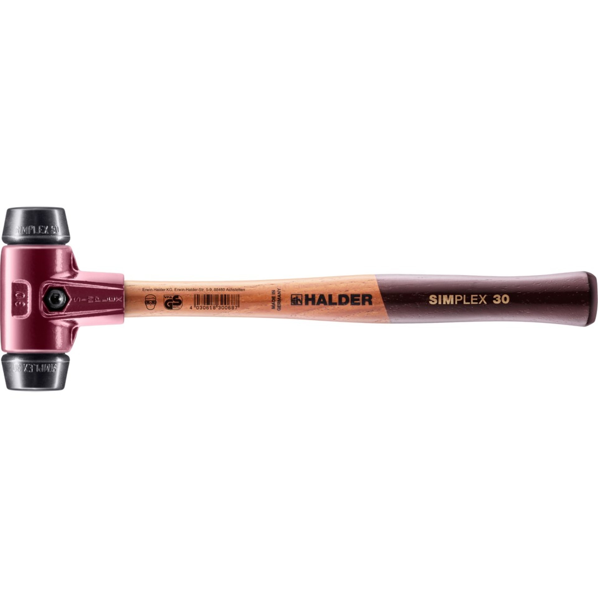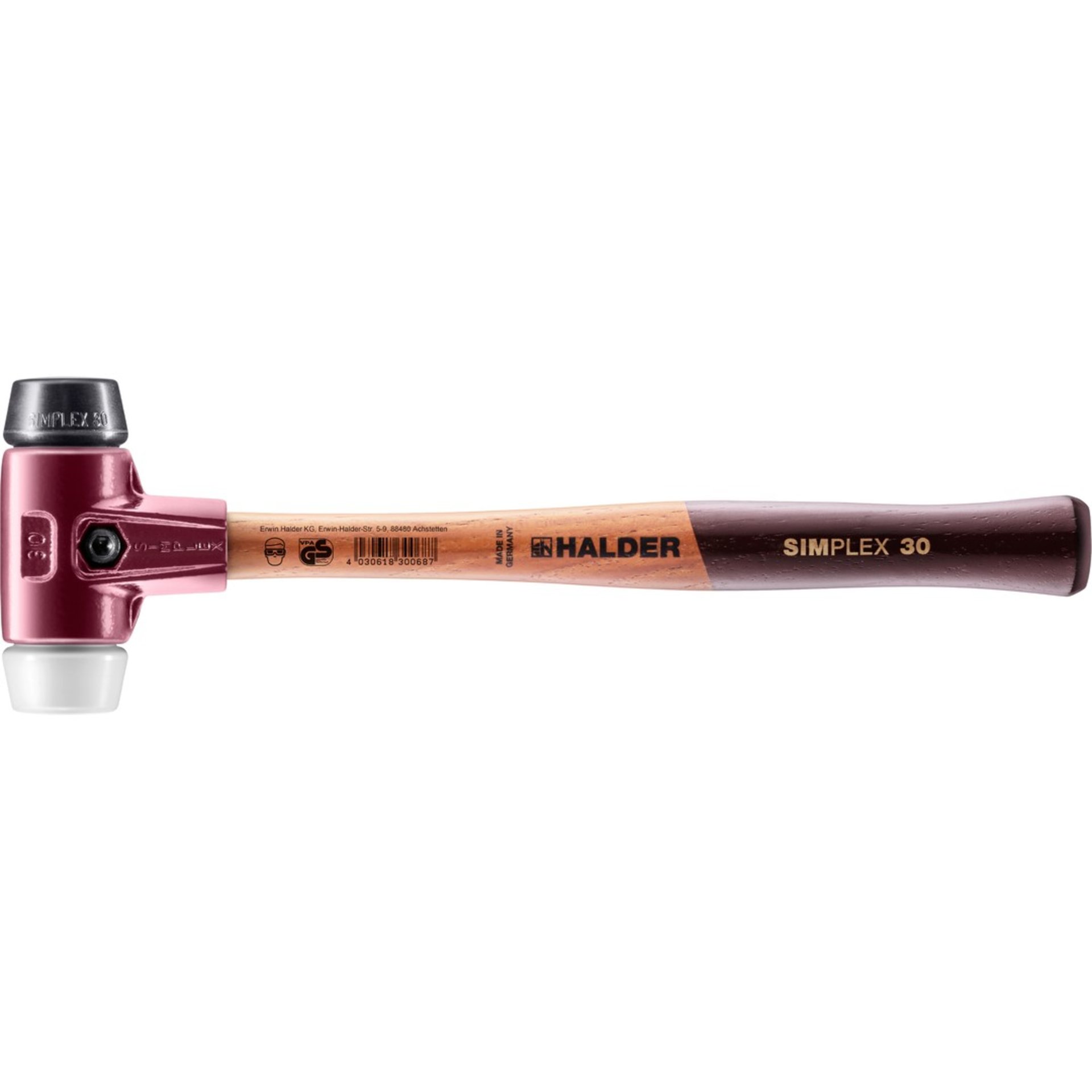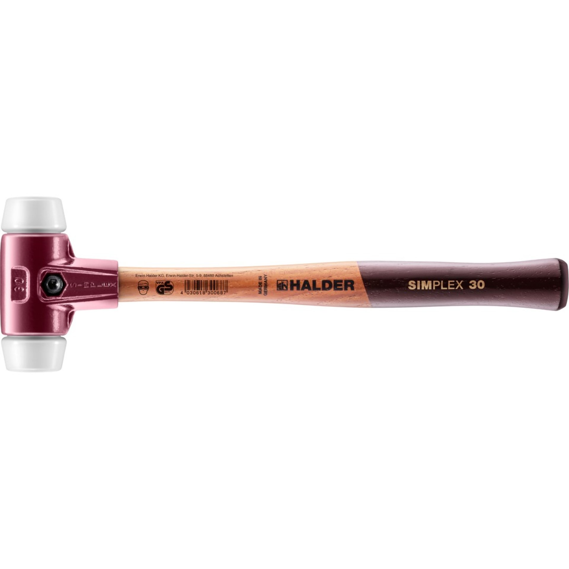 Der SIMPLEX-Schonhammer der Serie 3026 mit der Einsatzkombination Gummikomposition / Plastik ist eine der Topseller aus dem Hause Halder.Der mittelharte Gummi-Einsatz (Serie 3202) ist sehr verschleißarm, dämpfend und geruchsneutral und hält um ein Vielfaches länger als ein herkömmlicher Gummi-Hammer.Der rote Plastik-Einsatz (Serie 3206) ist hart und zudem öl- und fettbeständig. Diese Einsatzkombination deckt ein breites Spektrum an Anwendungen ab.Das Gehäuse aus Temperguss besitzt eine integrierte Stielschutzhülse, die für eine hohe Bruchsicherheit sorgt.Der hochwertige, schwingungsdämpfende, ergonomisch geformte Holzstiel ist im Griffbereich doppelt lackiert und somit schmutzunempfindlich.Gemäß dem cleveren SIMPLEX-Prinzip sind alle Komponenten austauschbar und nachrüstbar. Dies schont nicht nur den Geldbeutel, sondern auch Ressourcen.Erhältlich ist diese Ausführung von Größe D30mm bis D60mm und in D60mm mit Gummi-Einsatz mit Standfuß (3026.260).Produktmerkmale:SIMPLEX–Schonhammer in der Einsatzkombination Gummikomposition (schwarz, mittelhart, dämpfend, geruchsneutral, verschleißarm) / Plastik (rot, hart, öl- und fettbeständig).Gehäuse aus Temperguss mit integrierter Stielschutzhülse und hoher Bruchsicherheit.Hochwertiger, schwingungsdämpfender, ergonomisch geformter Holzstiel; Griffbereich doppelt lackiert (schmutzunempfindlich).Alle Teile sind austauschbar / nachrüstbar, somit sehr wirtschaftlich und Ressourcen schonend.Erhältlich von Größe D30mm bis D60mm und in D60mm mit Gummi-Einsatz mit Standfuß.Halder Topseller für eine Vielzahl von Anwendungen.Anwendungsgebietefür leichte bis mittelschwere Arbeiten, Montage-/Reparaturarbeiten im Kfz-/Nfz-Bereich, Ausbeularbeiten, Wartungsarbeiten, Gerüstbau, Zeltbau, Fertighausbau, ZimmereiWerkstoffStielHolzSchlageinsatz 1Gummikomposition, schwarzmittelhartdämpfendgeruchsneutralverschleißarmSchlageinsatz 2Plastik, rothartöl- und fettbeständiguniversellGehäuseTemperguss