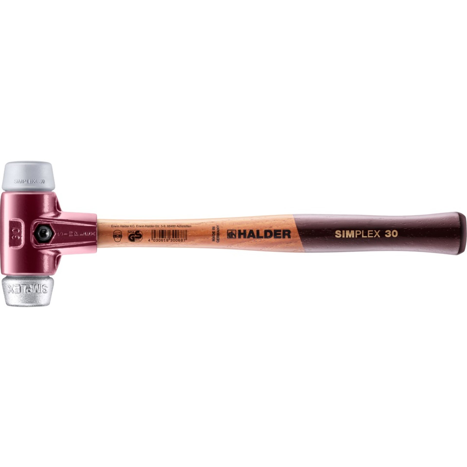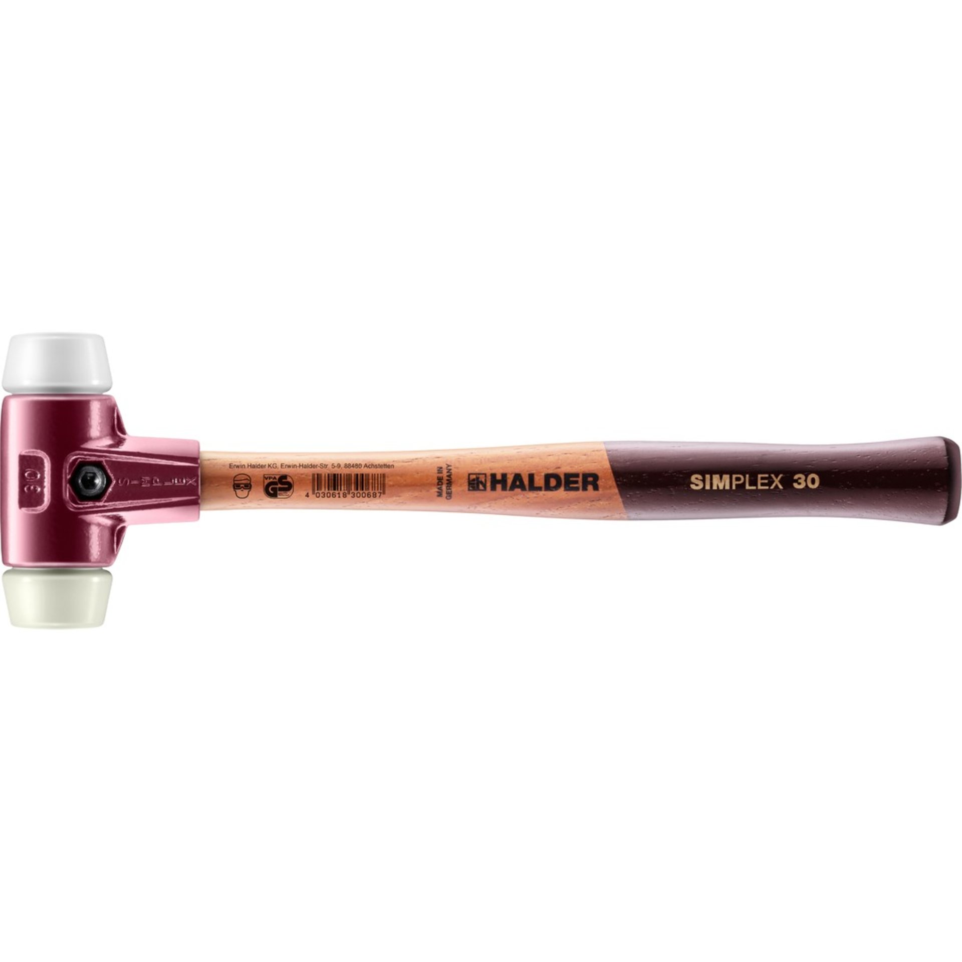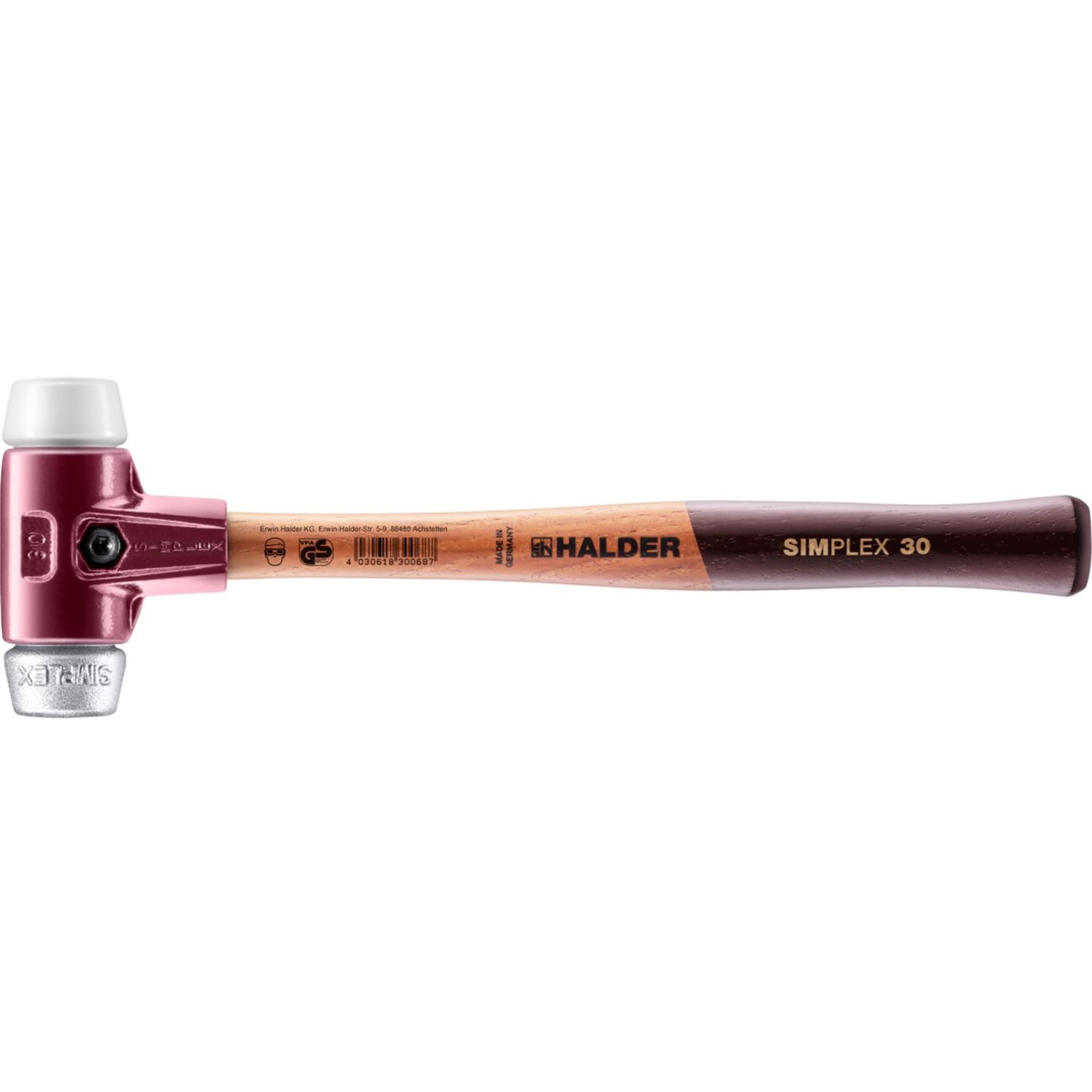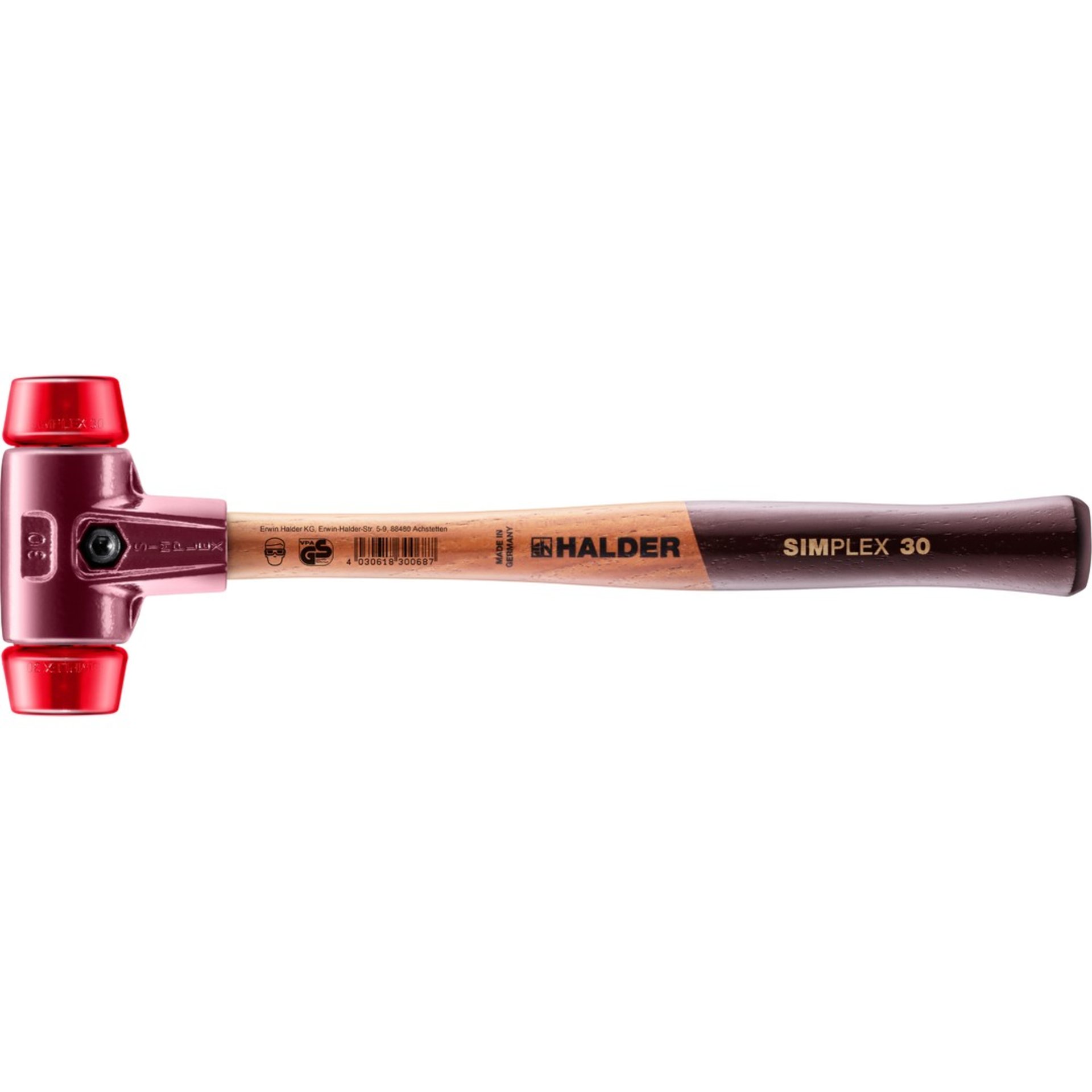 Der SIMPLEX-Schonhammer der Serie 3026 mit der Einsatzkombination Gummikomposition / Plastik ist eine der Topseller aus dem Hause Halder.Der mittelharte Gummi-Einsatz (Serie 3202) ist sehr verschleißarm, dämpfend und geruchsneutral und hält um ein Vielfaches länger als ein herkömmlicher Gummi-Hammer.Der rote Plastik-Einsatz (Serie 3206) ist hart und zudem öl- und fettbeständig. Diese Einsatzkombination deckt ein breites Spektrum an Anwendungen ab.Das Gehäuse aus Temperguss besitzt eine integrierte Stielschutzhülse, die für eine hohe Bruchsicherheit sorgt.Der hochwertige, schwingungsdämpfende, ergonomisch geformte Holzstiel ist im Griffbereich doppelt lackiert und somit schmutzunempfindlich.Gemäß dem cleveren SIMPLEX-Prinzip sind alle Komponenten austauschbar und nachrüstbar. Dies schont nicht nur den Geldbeutel, sondern auch Ressourcen.Erhältlich ist diese Ausführung von Größe D30mm bis D60mm und in D60mm mit Gummi-Einsatz mit Standfuß (3026.260).Produktmerkmale:SIMPLEX–Schonhammer in der Einsatzkombination Gummikomposition (schwarz, mittelhart, dämpfend, geruchsneutral, verschleißarm) / Plastik (rot, hart, öl- und fettbeständig).Gehäuse aus Temperguss mit integrierter Stielschutzhülse und hoher Bruchsicherheit.Hochwertiger, schwingungsdämpfender, ergonomisch geformter Holzstiel; Griffbereich doppelt lackiert (schmutzunempfindlich).Alle Teile sind austauschbar / nachrüstbar, somit sehr wirtschaftlich und Ressourcen schonend.Erhältlich von Größe D30mm bis D60mm und in D60mm mit Gummi-Einsatz mit Standfuß.Halder Topseller für eine Vielzahl von Anwendungen.Anwendungsgebietefür leichte bis mittelschwere Arbeiten, Montage-/Reparaturarbeiten im Kfz-/Nfz-Bereich, Ausbeularbeiten, Wartungsarbeiten, Gerüstbau, Zeltbau, Fertighausbau, ZimmereiWerkstoffStielHolzSchlageinsatz 1Gummikomposition, schwarzmittelhartdämpfendgeruchsneutralverschleißarmSchlageinsatz 2Plastik, rothartöl- und fettbeständiguniversellGehäuseTemperguss