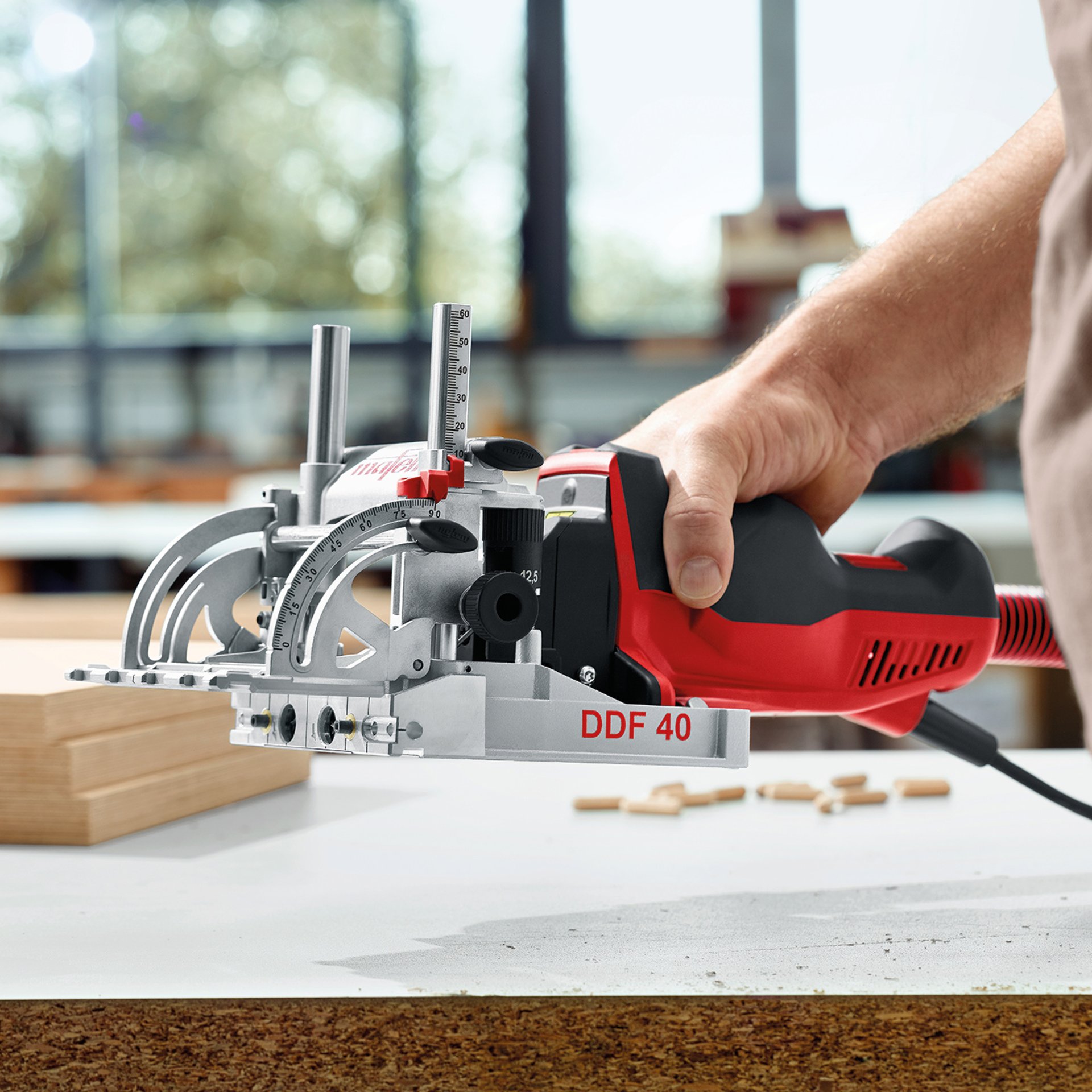 Mit dem DuoDübler DDF 40 wird das Setzen hochpräziser Dübellöcher noch einfacher und effizienter. Er steht für ein extrem breites Einsatzspektrum, leichtes Handling dank neuartiger Ergonomie sowie absolut formschlüssige, stabile Verbindungen. Ob Werkstatt oder Montage: Eine höhere Verbindungsqualität lässt sich mit einer handgeführten Maschine nicht erreichen. Ob Außenecke, Mittelwand oder Lochreihe: Der DDF 40 ermöglicht nicht nur die Präzision einer Stationärmaschine, sondern schafft das mit Standard-Rundholzdübeln auch besonders kostengünstig. Außerdem ist dank Doppellochtechnik schon bei der Montage eine extrem hohe Stabilität gewährleistet.