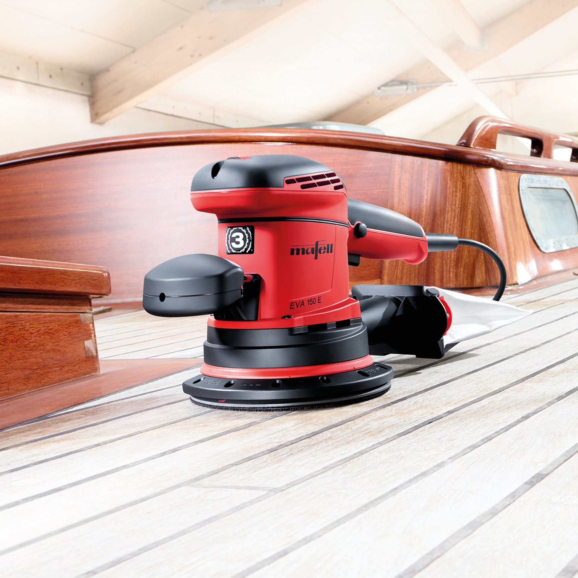 Der EVA 150 E ist der Exzenterschleifer für hohen Abtrag, ein sauberes Arbeitsumfeld und beste Ergebnisse. So erhalten alle Holzarten und Plattenwerkstoffe, aber auch Lacke, Farben und Gipsspachtel eine exzellente Oberfläche. Er bietet Ihnen eine um 20 Prozent höhere Drehzahl als herkömmliche Exzenterschleifer. Das erhöht den Abtrag spürbar. Ihr Vorteil: Bei gleicher Oberflächenqualität sind Sie bis zu 20 % schneller am Ziel und sparen letztendlich Kosten. Auch für den Dauereinsatz ist der neue Exzenterschleifer von MAFELL bestens geeignet. Der Schwingungsemissionswert des EVA 150 E liegt unter 2,5 m/s² und erlaubt deshalb einen Einsatz ohne Zeitlimit. Softgripeinlagen gewährleisten Ihnen in jeder Arbeitsposition die optimale Kontrolle über den Exzenterschleifer und sorgen für ein angenehmes, sicheres „Griffgefühl“.