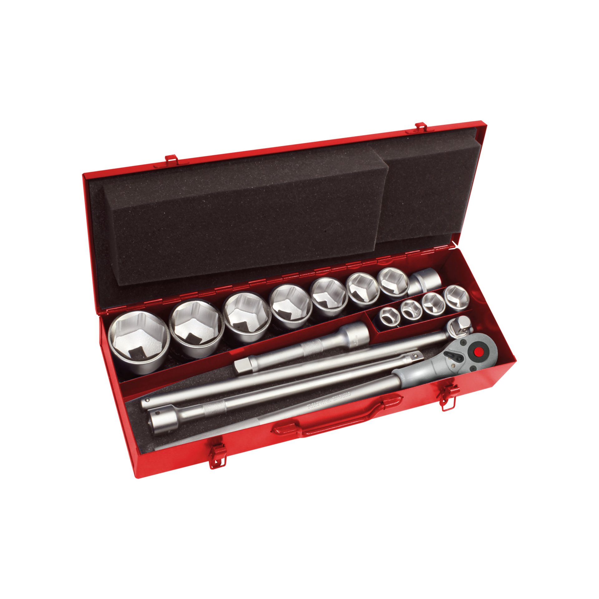 1/2‘‘ Steckschlüssel-Einsatz, sechskant 8, 9, 10, 11, 12, 13, 14, 15, 16, 17, 18, 19, 20, 21, 22, 24, 27, 30, 32 mm1/2‘‘ Steckschlüssel-Einsatz, sechskant, lang 10, 13, 17 mm1/2‘‘ Zündkerzen-Einsatz 16, 21 mm1/2‘‘ Kardan-Gelenk1/2‘‘ Verlängerung 125, 250 mm1/2‘‘ Adapter-Gleitstück 3/8‘‘x1/2‘‘1/2‘‘ Umschaltknarre, 45 Zähne 250 mm.