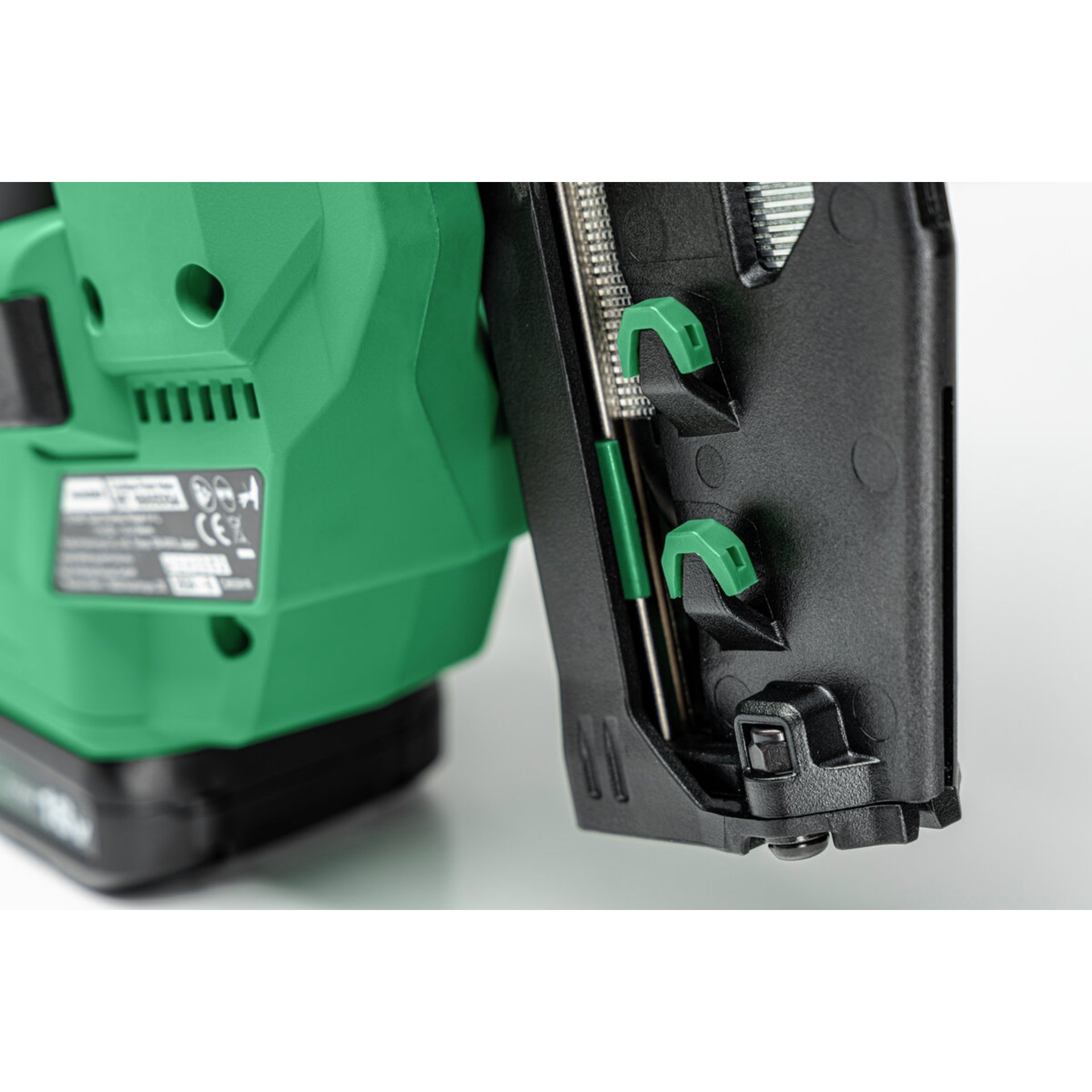 - Schnellentriegelung für werkzeugloses Entfernen verklemmter Stiftnägel