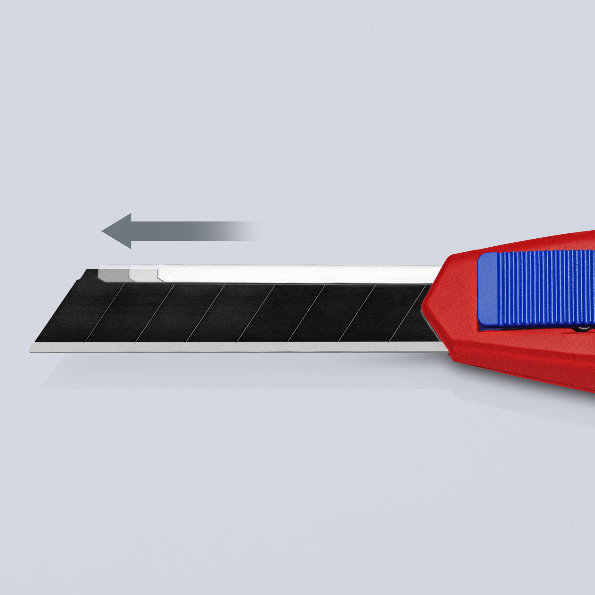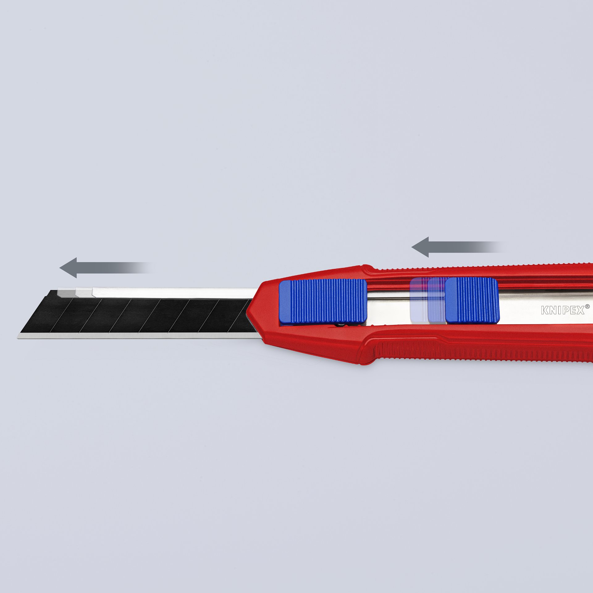 90 10 165 BK KNIPEX CutiX® Innovative, variabel ausfahrbare Stabilisierungsschiene: vielseitiger Einsatz, schneller Arbeiten, präzises Schneiden. Ohne Verletzungsrisiko gezielt Druck auf Klingenrückseite ausüben, kein unabsichtliches Biegen oder Brechen der Klinge. Robustes, langlebiges Magnesiumgehäuse: leicht wie Kunststoff, stark wie Alu-Druckguss. Festsitzende Klinge dank hochwertiger Klingenverriegelung: sicherer Sitz beim Schneiden, Schieben und Schaben. Handlich: 165 mm lang, ca. 111 g leicht. Erstausrüstung mit hochwertigen Abbrechklingen, zwei Ersatzklingen in der Griffschublade, werkzeuglos wechselbar. Geeignet für handelsübliche 18 mm hohe Klingenformen: glatt, gewellt, mit Haken. Liegt angenehm in der Hand durch schlanke Form und viele Griffzonen: festes und rutschsicheres Greifen, komfortables Halten. Flache, ergonomische Schieber separat für Klinge und Stabilisierungsschiene, kein versehentliches Betätigen der Schieber. Zuverlässige Klingenaufnahme: Sicherer Halt der Klinge durch gehärteten Stahlstift. Hinteres Griffende geschlossen: Kein Herausrutschen von Klingenschieber und Klinge. Befestigungsöse für Werkzeugsicherung mit KNIPEX Tethered Tools* System.