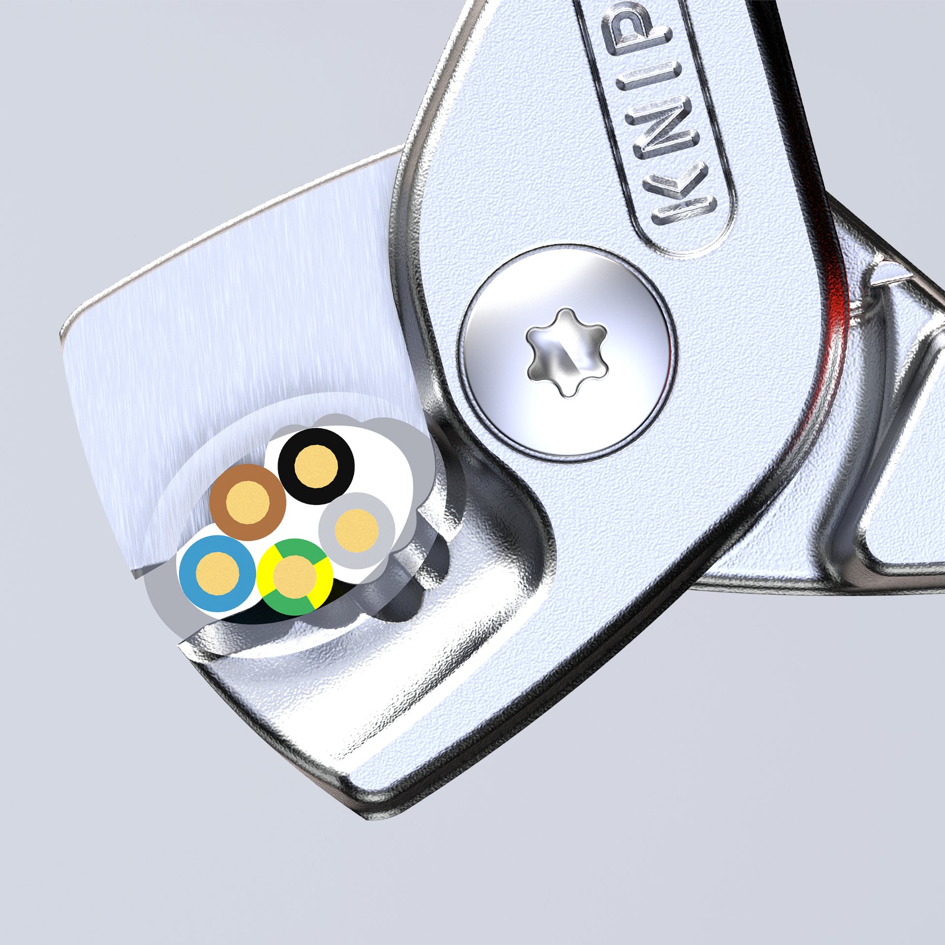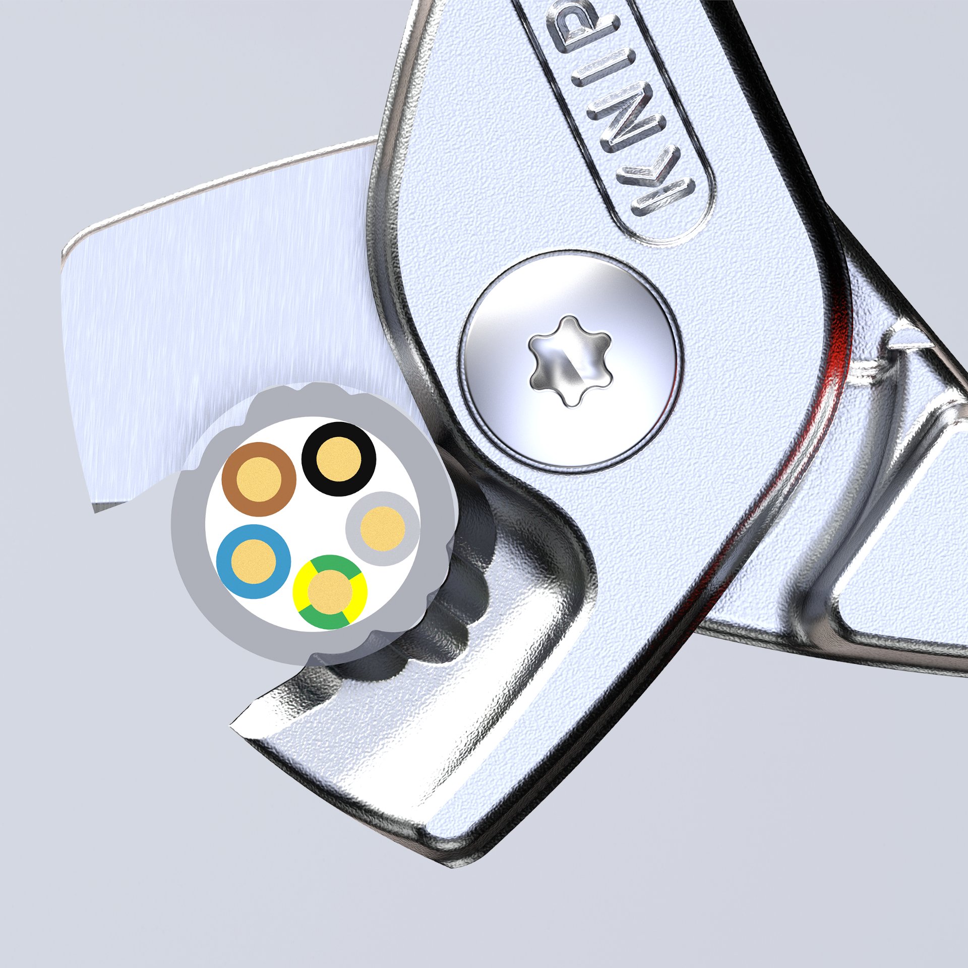 95 11 160 KNIPEX StepCut® Klein, leicht, stark: angenehm Schneiden ohne zu quetschen bei nur 160 mm Größe. Spürbar weniger Kraftaufwand: Die Abstufungen schneiden Adern nacheinander, der Schnitt ist bis zu 40 % leichter als bei Standard-Kabelscheren gleicher Länge!. Ergonomische Schenkelgestaltung: optimales Schneidgefühl auch bei größeren Kabeldurchmessern. Schneidet Cu- und Al-Mehrleiterkabel feinadrig bis Ø 15 mm (50 mm²). Schneidet massive Cu- und Al-Kabel bis 5 x 4 mm². Schneidet ohne zu quetschen. Geschraubtes Gelenk: präzise, leichtgängig, langlebig. Klemmschutz für sicheres Arbeiten. Nicht für Stahldraht und hartgezogene Kupferleiter geeignet. Schneiden zusätzlich induktiv gehärtet, Schneidenhärte ca. 56 HRC. - Schneidwert Cu-Kabel, mehrdrähtig: 50mm² - Schneidwert Cu-Kabel, mehrdrähtig: Ø 15mm - AWG: 1 / 0