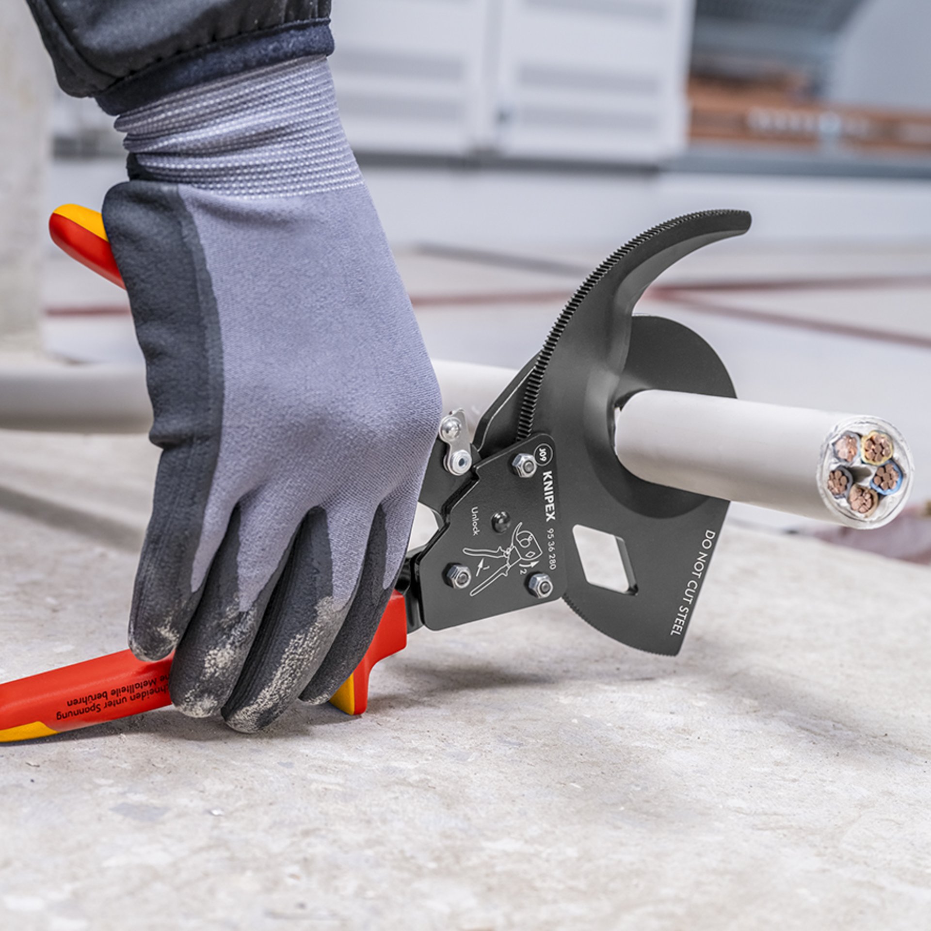 Eigenschaften "KNIPEX 95 36 280 Kabelschneider (Ratschenprinzip) isoliert mit Mehrkomponenten-Hüllen, VDE-geprüft schwarz lackiert 280 mm"
