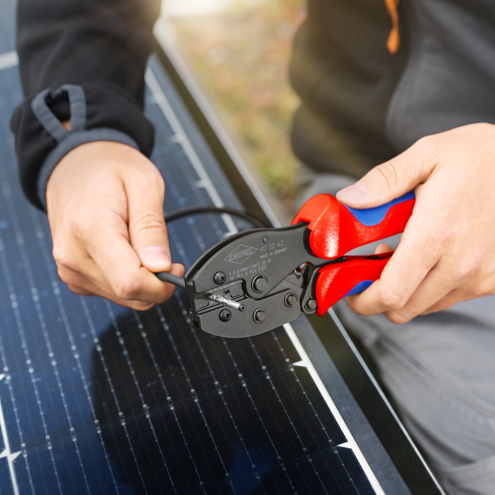 97 52 42 SB KNIPEX PreciForce® Mit verbesserter Crimp-Geometrie für sehr gute Leitfähigkeit. Gleichbleibend hohe Crimpqualität durch Präzisionseinsätze und Zwangssperre (entriegelbar). Crimpdruck ist werkseitig präzise eingestellt (kalibriert). Hohe Crimpkraft durch effiziente Hebelübersetzung. Gutes Handling durch günstige Griffstellung, geringes Gewicht, kurze Bauform und ergonomisch geformte Griffe. Crimpeinsatz ist nicht wechselbar. für MC4®-/MC4® EVO 2-Verbinder. MC4® ist eine registrierte Marke der Stäubli Electrical Connectors AG. - AWG: 12 / 10