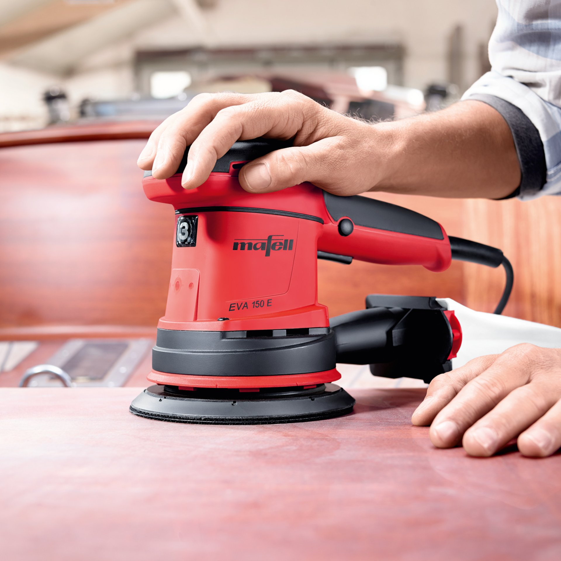 Der EVA 150 E ist der Exzenterschleifer für hohen Abtrag, ein sauberes Arbeitsumfeld und beste Ergebnisse. So erhalten alle Holzarten und Plattenwerkstoffe, aber auch Lacke, Farben und Gipsspachtel eine exzellente Oberfläche. Er bietet Ihnen eine um 20 Prozent höhere Drehzahl als herkömmliche Exzenterschleifer. Das erhöht den Abtrag spürbar. Ihr Vorteil: Bei gleicher Oberflächenqualität sind Sie bis zu 20 % schneller am Ziel und sparen letztendlich Kosten. Auch für den Dauereinsatz ist der neue Exzenterschleifer von MAFELL bestens geeignet. Der Schwingungsemissionswert des EVA 150 E liegt unter 2,5 m/s² und erlaubt deshalb einen Einsatz ohne Zeitlimit. Softgripeinlagen gewährleisten Ihnen in jeder Arbeitsposition die optimale Kontrolle über den Exzenterschleifer und sorgen für ein angenehmes, sicheres „Griffgefühl“.