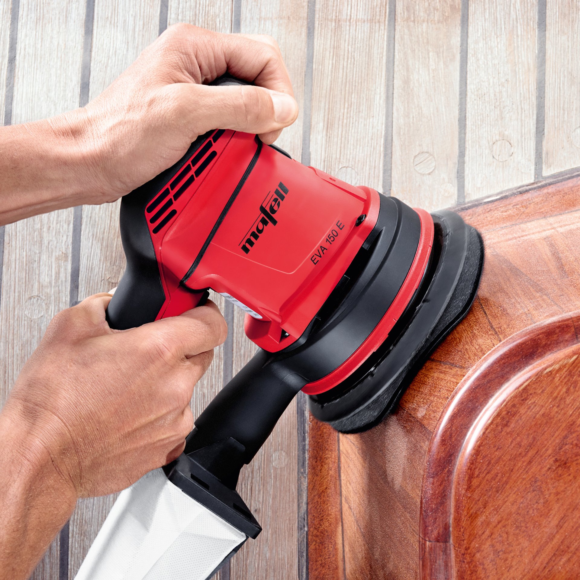 Der EVA 150 E ist der Exzenterschleifer für hohen Abtrag, ein sauberes Arbeitsumfeld und beste Ergebnisse. So erhalten alle Holzarten und Plattenwerkstoffe, aber auch Lacke, Farben und Gipsspachtel eine exzellente Oberfläche. Er bietet Ihnen eine um 20 Prozent höhere Drehzahl als herkömmliche Exzenterschleifer. Das erhöht den Abtrag spürbar. Ihr Vorteil: Bei gleicher Oberflächenqualität sind Sie bis zu 20 % schneller am Ziel und sparen letztendlich Kosten. Auch für den Dauereinsatz ist der neue Exzenterschleifer von MAFELL bestens geeignet. Der Schwingungsemissionswert des EVA 150 E liegt unter 2,5 m/s² und erlaubt deshalb einen Einsatz ohne Zeitlimit. Softgripeinlagen gewährleisten Ihnen in jeder Arbeitsposition die optimale Kontrolle über den Exzenterschleifer und sorgen für ein angenehmes, sicheres „Griffgefühl“.