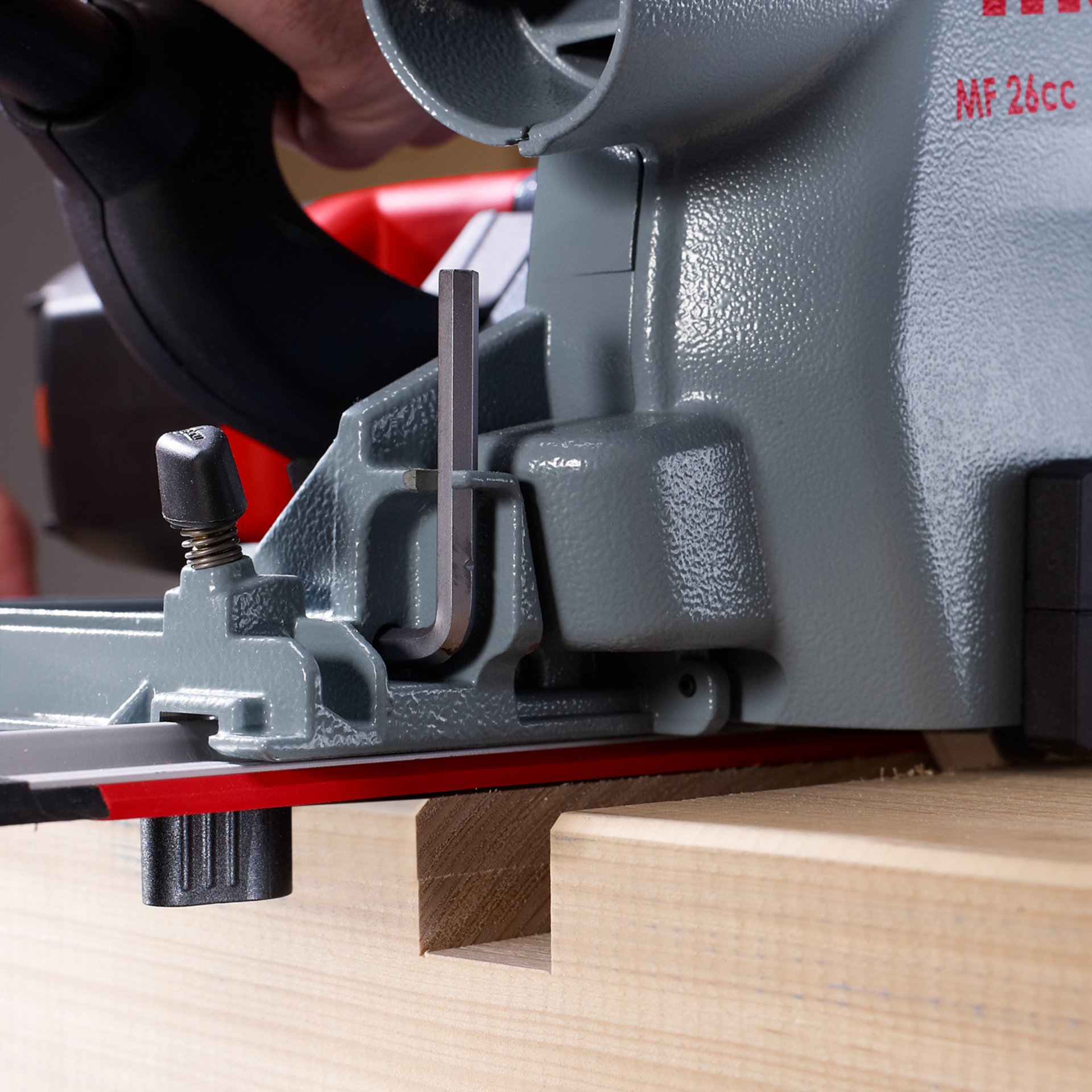 Die Bauweise der MF 26 cc besticht durch extrem robuste, hochwertige und präzise gefertigte Bauteile, wie z. B. das leichte Magnesium-Druckgussgehäuse oder die stoßfesten, glasfaserverstärkten Kunststoffteile. Die Multifräse MF 26 cc kann bis zu 26 mm auf der Führungsschiene auch mit einem Sägeblatt eingesetzt werden. Was für das Sägen gilt, gilt auch für das Fräsen. Echte Fräspräzision lässt sich am besten mit dem Führungsschienen-System F umsetzen. Stufenlose Drehzahleinstellung bis zu 6250 1/min. Für das Fräsen, Sägen und Schlitzen in verschiedensten Materialien.