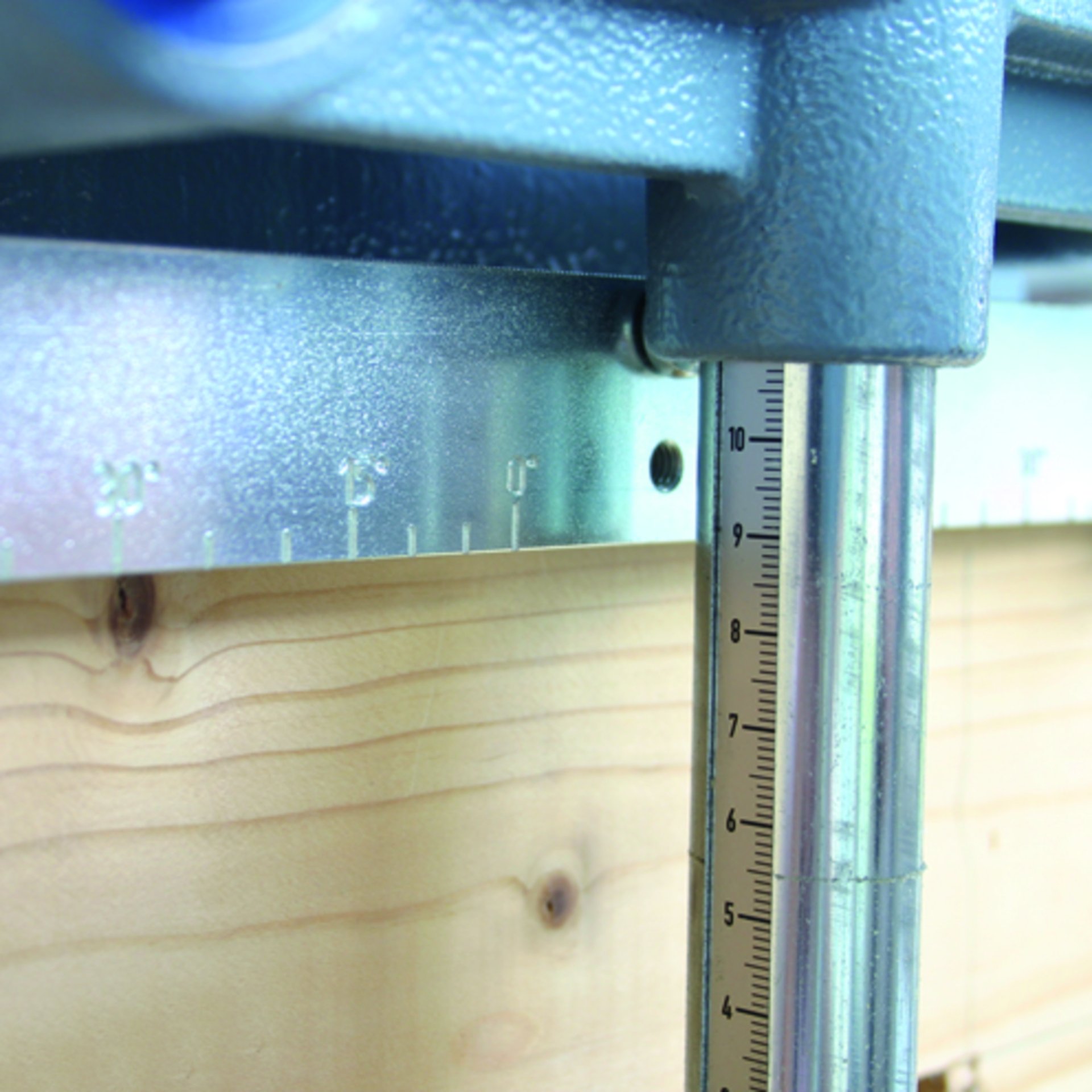 Damit geht’s richtig in die Tiefe! Mit 500 mm Schlitztiefe und 50 mm Schlitzbreite mit jedem einzelnen Einstich. Der Führungswinkel lässt sich nach beiden Seiten bis 45 Grad einstellen. Mitgeliefert werden 3 Führungsstücke (3, 5 und 7 mm), die in das vordere Ende der Führungsschiene gesteckt werden können. Damit ist es möglich, in einem zweiten Arbeitsgang die Schlitzbreite zu erweitern. Das eingesetzte Führungsstück verhindert dabei ein Verlaufen in den zuvor geschlitzten Einstich.