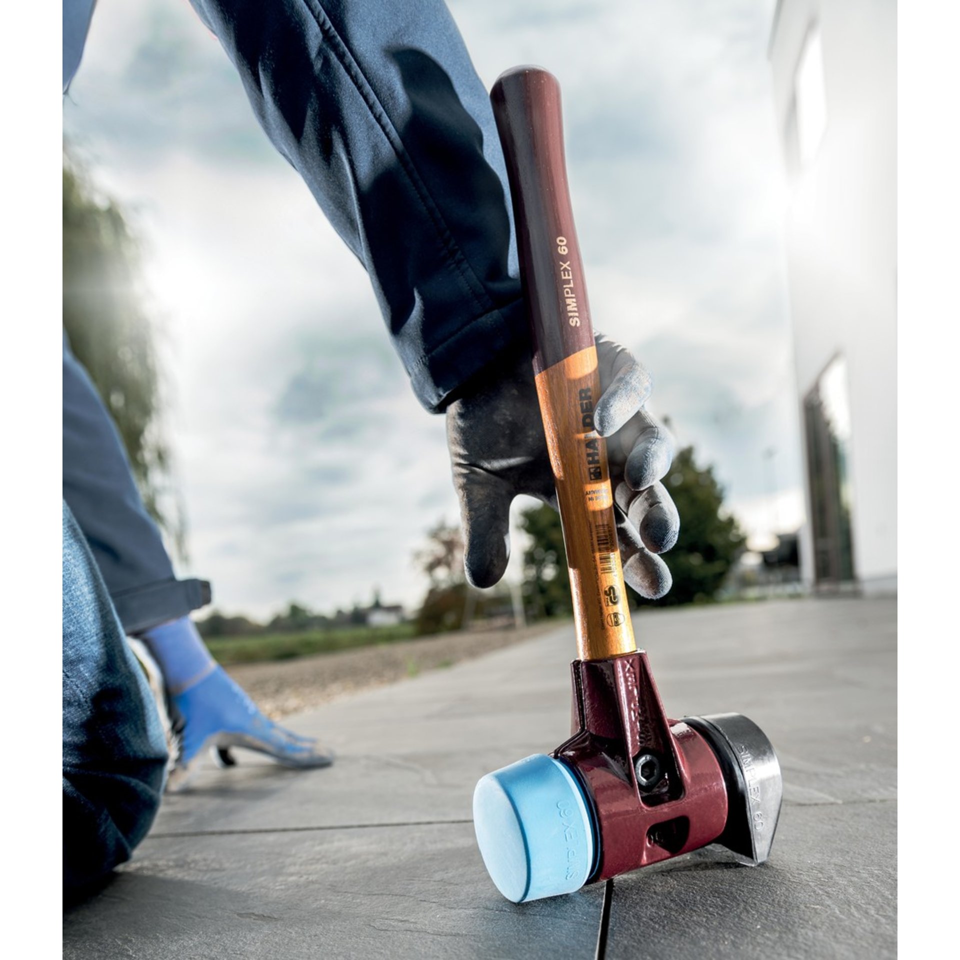 • SIMPLEX–Schonhammer in der Einsatzkombination TPE-soft (blau, weich, abriebfrei) / Gummi-Einsatz mit Standfuß (Serie 3202.2) für rückenschonendes Arbeiten und weniger bücken.